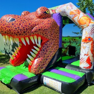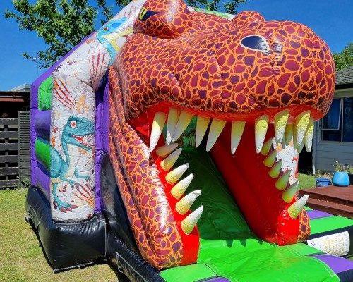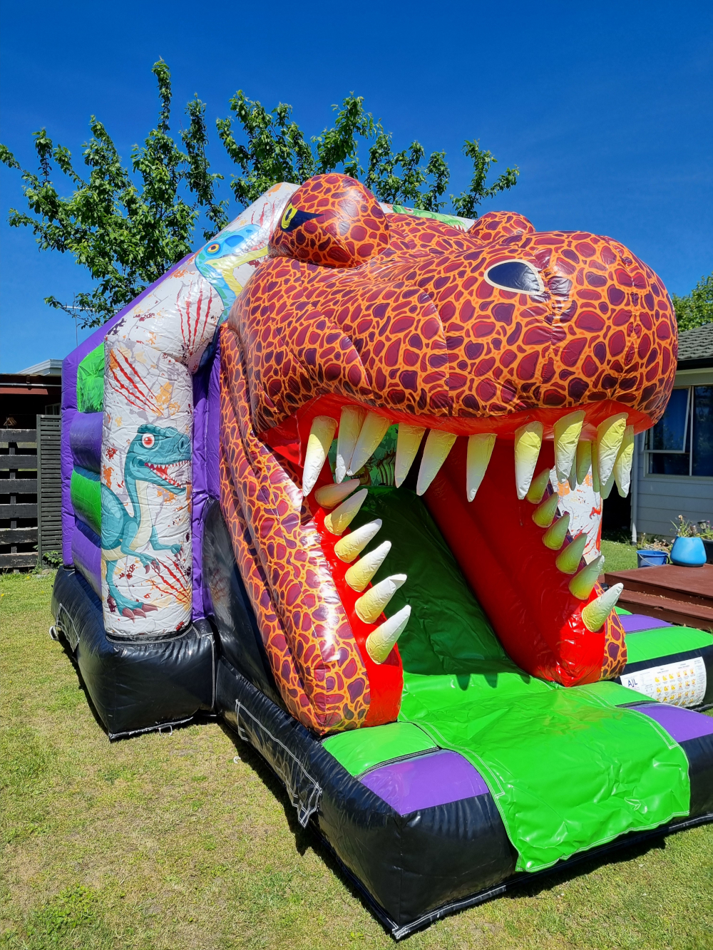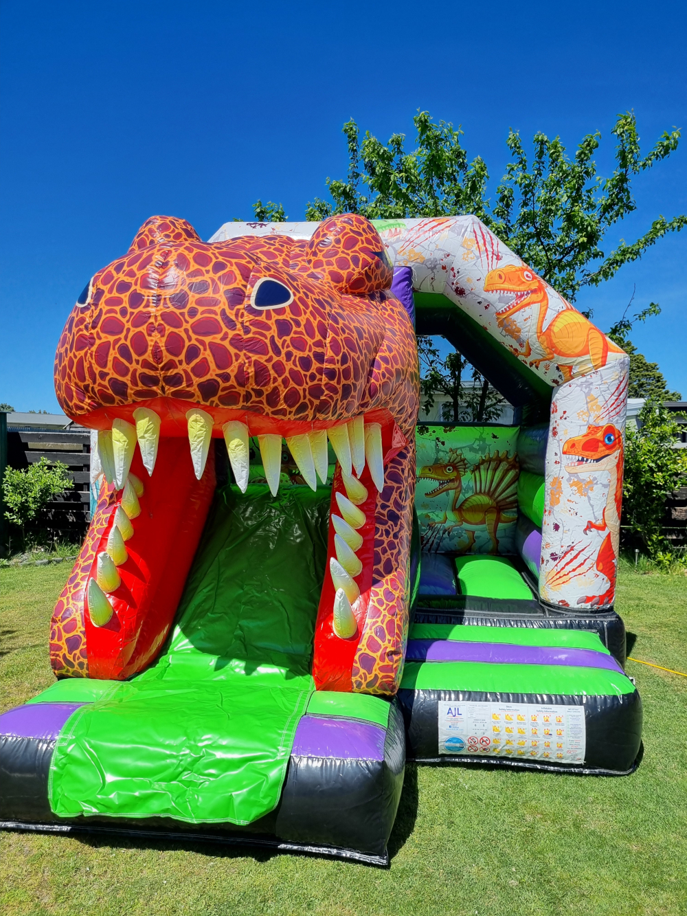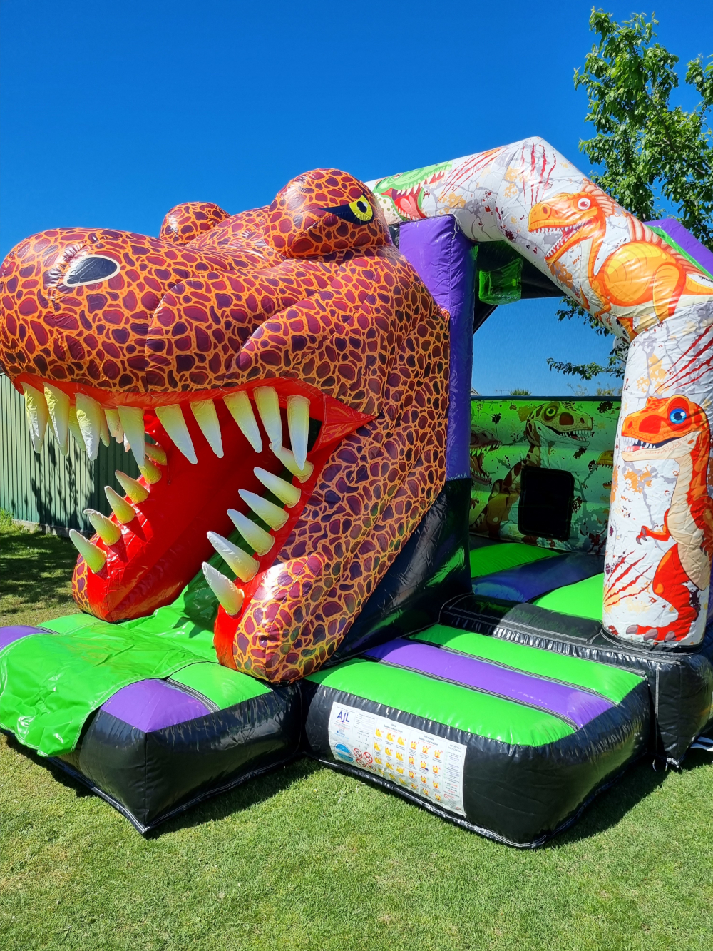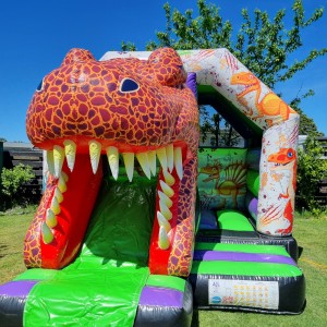 This inflatable castle is brightly coloured with dinosaur imagery everywhere and a 3D dinosaur head at the front with the slide coming through it's teeth. The bouncy castle is fully enclosed.