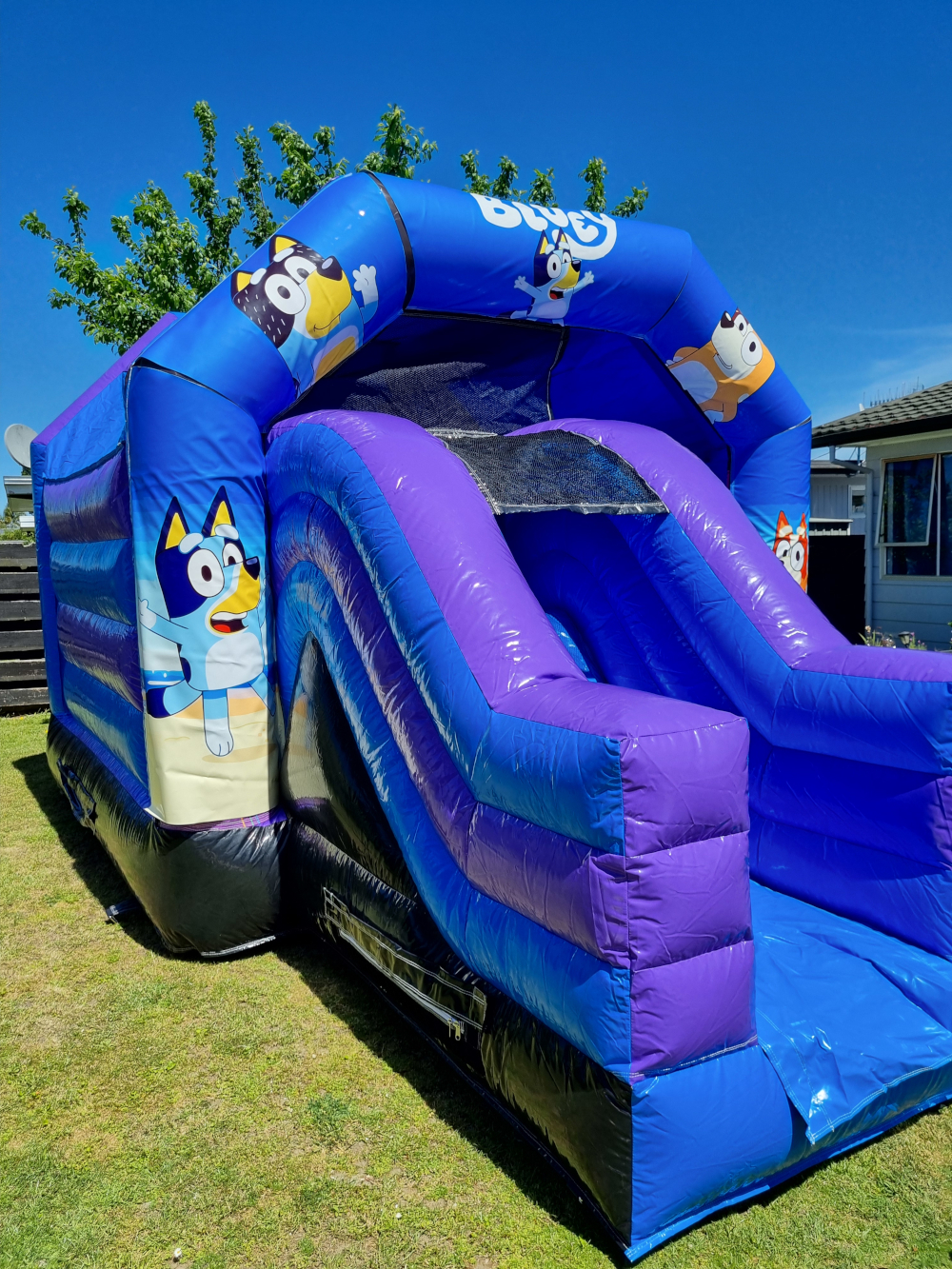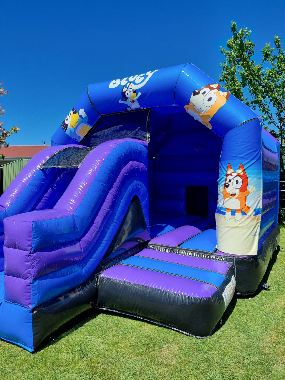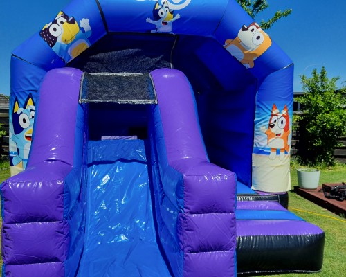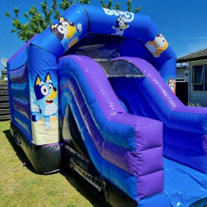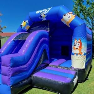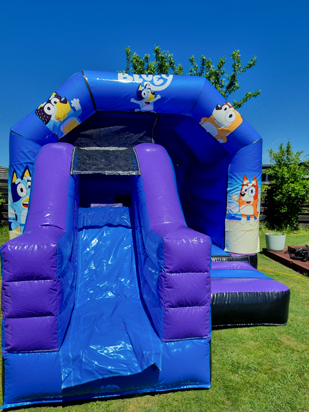 This inflatable castle is brightly coloured with Bluey imagery all around the front of the castle. The bouncy castle is fully enclosed.